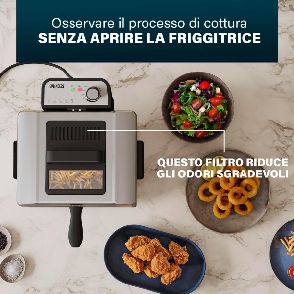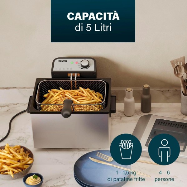 La friggitrice Princess 184090 unisce potenza e capacità con un volume di 5 litri e una potente uscita di 3270W.