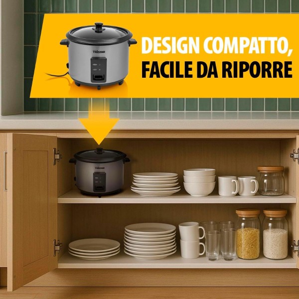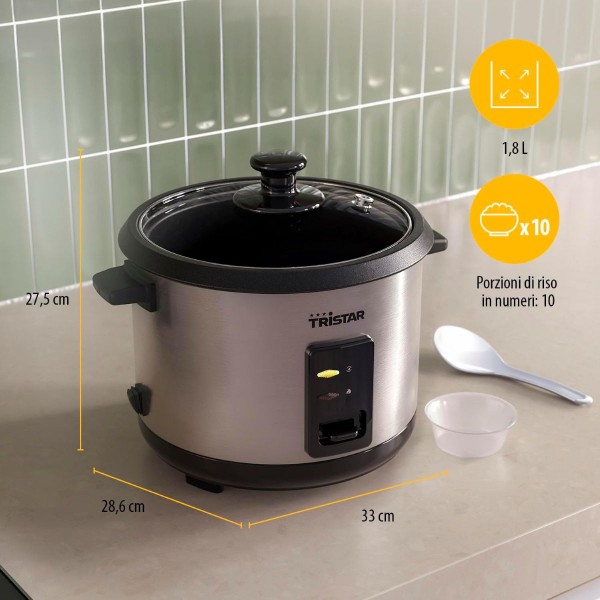 Il Tristar RK-6148 è un cuociriso completamente automatico con una generosa capacità di 1,8 litri, ideale per preparare fino a 10 porzioni di riso. Grazie alla sua potenza di 700 W, cuoce il riso in modo rapido e uniforme. Quando il riso è pronto, il dispositivo si spegne automaticamente e attiva la funzione di mantenimento in caldo, così il riso resta perfetto per ore.