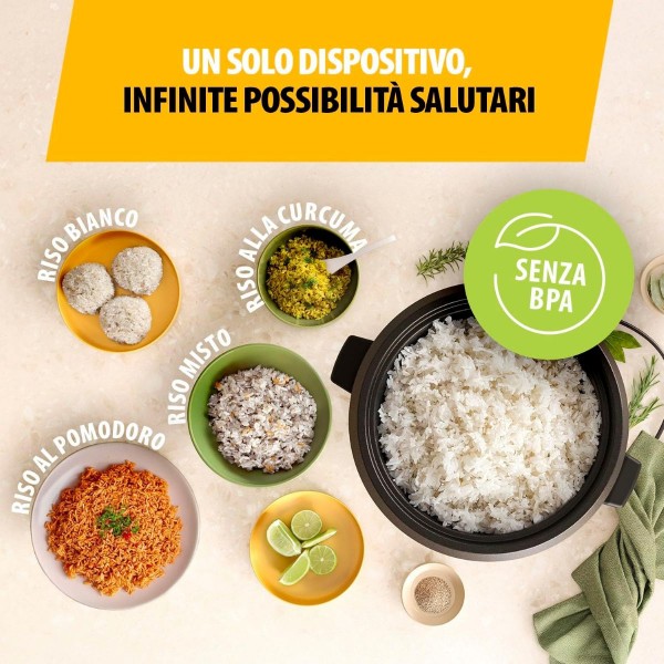 Questo cuociriso è adatto a tutti i tipi di riso: bianco, integrale, per sushi e altro ancora. La pentola interna removibile con rivestimento antiaderente evita che il riso si attacchi e ne facilita la pulizia.